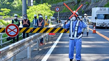 豪雨による通行止め想定訓練 国道41号、道路遮断機など操作確認