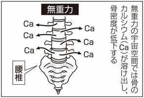 活動の乏しい高齢の骨粗しょう症患者では腰椎や大腿(だいたい)骨など姿勢を支える骨の量が1年間に1・0~1・5%減少しますが、これと同量の骨密度の低下が1カ月の宇宙旅行で起こります。骨の強度はカルシウムによって保たれていますので、無重力の宇宙滞在中はこのカルシウムが1日当たり約0・3グラム溶け出し、尿中に排出されます=図=。すると腎臓や尿管で結晶化し、尿路結石となることがあります。尿路結石は激しい痛みを引き起こしますので、医療が受けられず、しかも地上への緊急搬送も困難な宇宙では重大な問題です。荷重がかからない腕はあまり影響を受けません。