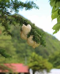 モリアオガエルの卵ぶらり 高山市 ため池の木に白い泡の塊