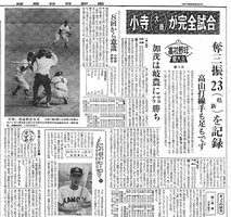 最後の打者を渾身(こんしん)の直球で三振に抑えた瞬間、大記録が誕生した。小寺さんは完全試合よりも、23個の三振を奪ってチームが勝てた喜びの方が大きかったが、マスコミはこぞって偉業を取り上げた。当日の夜のニュース番組でも紹介され、「とんでもないことをやったんだ」と自覚した。2回戦で、岐阜商に敗れるが、この年岐阜商が甲子園に出場、甲子園でも4強入りを果たした。