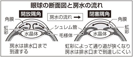 緑内障は、眼圧がその人の目にとって高過ぎることで起こります。そして、眼圧は目の中にある水(房水)の量によって決まります。房水は目の中の毛様体というところで出来て循環し、角膜と虹彩の境目にある「隅角(ぐうかく)」というところから目の外に排出されて量を一定にして眼圧を維持しています。緑内障の型の中には、ここが広い場合(開放隅角緑内障)と狭い場合(閉塞隅角緑内障)があります。広ければ房水は目の外に容易に出られますが、閉塞隅角の場合は隅角で抵抗があります。そして、特に瞳が開く(散瞳する)ことで、虹彩の根元がより隅角に近づくため、隅角がより水が出て行きにくい状態になります。緑内障の人に使えないとされている薬は主にこの瞳が広がる薬です。