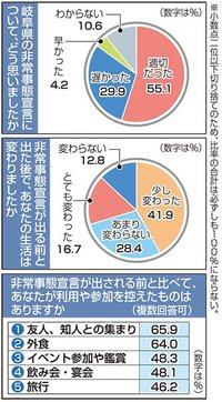 宣言後の生活については、「とても変わった」と「少し変わった」を足すと約60%だった。利用や参加を控えたサービス・行事を尋ねると「友人、知人との会合・集まり」が66%で最多。次いで「外食」が64%で、「コンサートや映画、講演会、サークル、スポーツなどのイベント参加や鑑賞」「飲み会・宴会」はいずれも48%。以下「旅行」「カラオケなどの遊戯施設での娯楽・レクリエーション」「店舗での買い物」「スポーツジムの利用」「冠婚葬祭」と続いた。