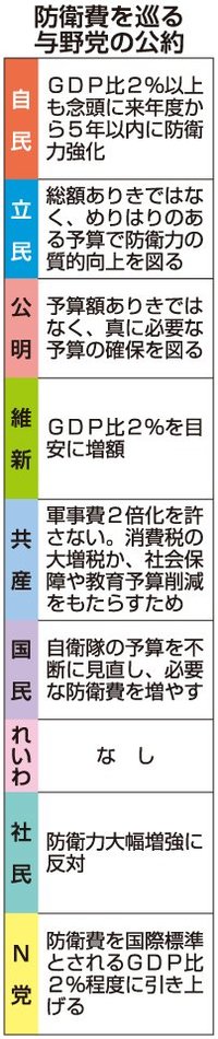 日本の防衛費は2022年度当初予算で過去最多の約5兆4千億円となった。10年連続で右肩上がりが続く。増額に積極的な姿勢を見せるのは、自民党と日本維新の会、NHK党。いずれも現状から倍増となる「GDP比2%」を参院選の公約に明記している。このほか立憲民主党は「総額ありきではなく、めりはりのある予算で防衛力の質的向上を図る」と反論しつつも、増額の余地は残した。公明党、国民民主党も防衛力強化は必要との立場を取る。