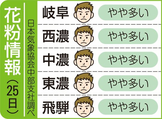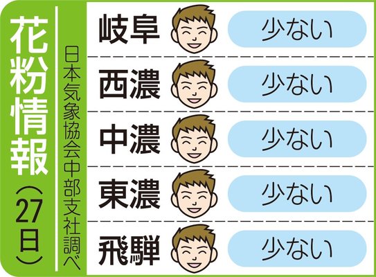 岐阜県内の花粉情報(28日) 岐阜県内の花粉飛散度は、以下の通り。(日本気象協会中部支社調べ)・岐阜少ない・西濃少ない・中濃少ない・東濃少ない・飛騨少ない県内全域で大量の花粉が飛散しており、外出時におけるマスクやメガネの着用... 2026年4月28日 07:53