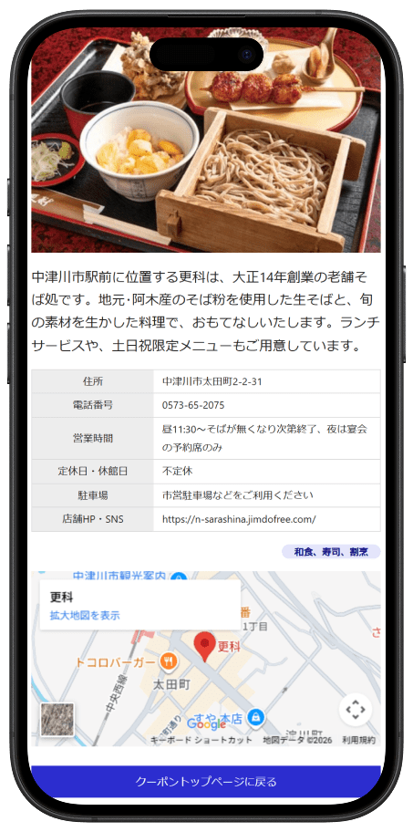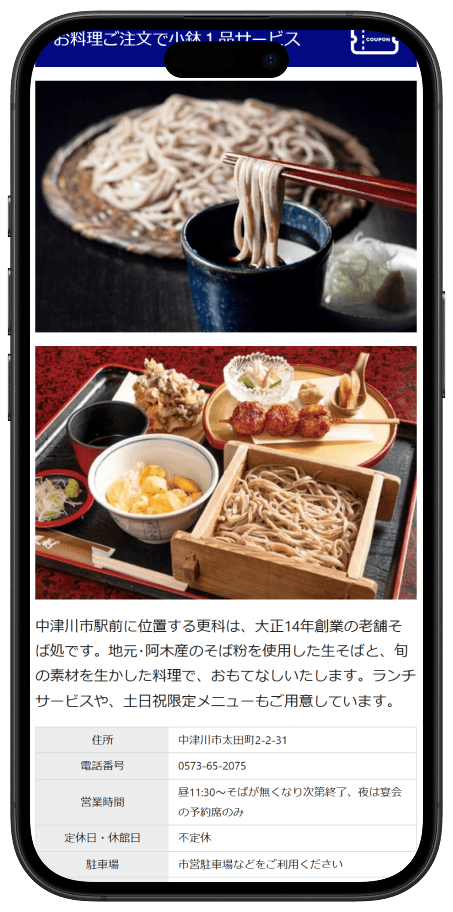 上部に①店舗・施設名②クーポン内容③写真1~2枚④店舗・施設の概要(100字程度)、下部は表形式で①住所②電話番号③営業時間④定休日・休館日⑤駐車場の有無④店舗・施設のHPやSNSのURL(リンクあり)を表示します。