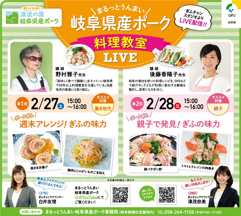 おうちにいながら豚肉料理が学べるオンライン料理教室「まるっとうんまい#岐阜県産ポーク 料理教室LIVE」が2月27・28日の両日に開催されます。参加無料で申し込み不要。
