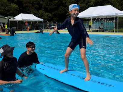 海なし県でサーフィン 児童が学校のプールで 水の怖さ学ぼうと企画 岐阜・多治見市