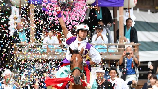 紙吹雪舞う中、神馬と若武者一体に 本巣市で馬駆け祭り 岐阜県重要無形民俗文化財