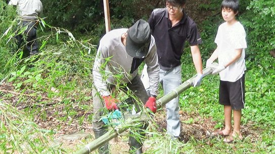 ごう音あげて竹を粉砕 伸びた竹を雑草の生育を抑える竹チップに再生