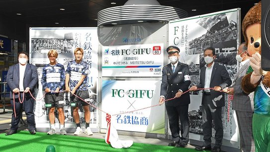 「名鉄FC岐阜駅」駅名看板お披露目 岐阜の玄関口でコラボ、期間限定