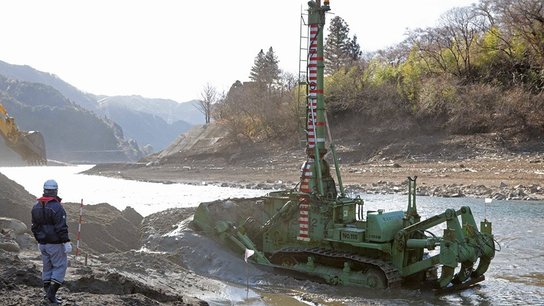 国内5台「水陸両用ブルドーザー」ダム湖で活躍 長い吸排気塔が特徴