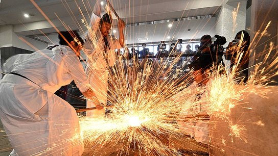 刀匠願いの火花散らす 岐阜・関市で日本刀打ち初め式