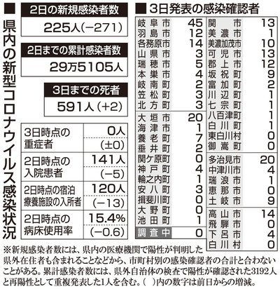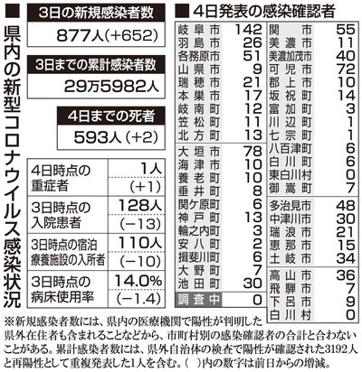 【4日・新型コロナ詳報】岐阜で877人感染、2人死亡 10歳未満の重症者1人確認 岐阜県と岐阜市は4日、県内で3日に新たに877人の新型コロナウイルス感染と、2人の死亡を確認したと発表した。新規感染者は前週の火曜日(9月27日)と比べ224人増加し、3日ぶりに前の週の同じ曜日... 2022年10月4日 18:49