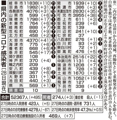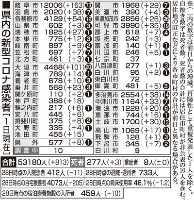 【1日・新型コロナ詳報】幼稚園や病院などクラスター4件 岐阜813人感染3人死亡 岐阜県と岐阜市は1日、県内39市町などで新たに813人の新型コロナウイルス感染と、計3人の死亡を確認したと発表した。新規感染者は前週の火曜日から262人減り、火曜日に1千人を下回るのは1月25日... 2022年3月1日 20:57