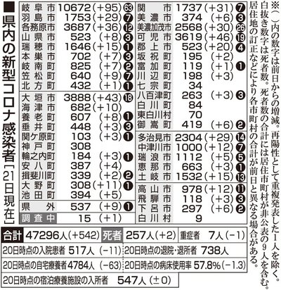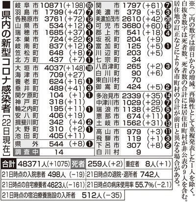 【22日・新型コロナ詳報】岐阜1075人感染 10歳未満が重症 岐阜県と岐阜市は22日、県内39市町などで新たに1075人の新型コロナウイルス感染と、岐阜市の100歳代と90代の女性の死亡を確認したと発表した。火曜日発表の新規感染者が千人を超えるのは、4週連... 2022年2月22日 20:23