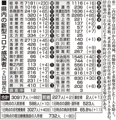 【2日・新型コロナ詳報】過去3番目882人感染 岐阜、自宅療養3027人 岐阜県と岐阜市は2日、県内37市町村などで新たに882人の新型コロナウイルス感染を確認したと発表した。1日当たりの感染者数としては過去3番目。また、高山市の90代男性と岐阜市の90代男性の死亡が... 2022年2月2日 21:14