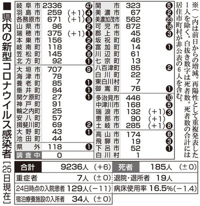 【26日速報】岐阜県で9人が新型コロナ感染、1人死亡 岐阜県と岐阜市は26日、県内で新たに9人の新型コロナウイルス感染と1人の死亡を確認したと発表した。県内の感染者は計9245人、死者は計186人となった。 2021年6月26日 15:34