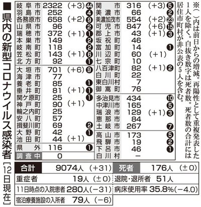 【12日・コロナ詳報】デイサービス施設、ヨガスタジオなど4件のクラスター拡大 岐阜県内で31人感染 岐阜県と岐阜市は12日、県内15市町で計31人の新型コロナウイルス感染を確認したと発表した。感染者は累計9074人となった。11日時点の入院患者は280人で、病床使用率は35・8%。入院患者が3... 2021年6月12日 18:28
