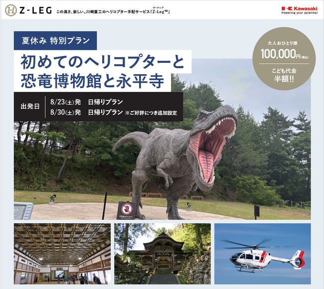 好評につき追加設定!【川崎重工グループのヘリコプター手配サービス Z-Leg(TM)】夏休み特別プラン「初めてのヘリコプターと恐竜博物館と永平寺」8月23日(土)発、8月30日(土)発(ランチ付き日帰り) 2025年7月23日 11:30