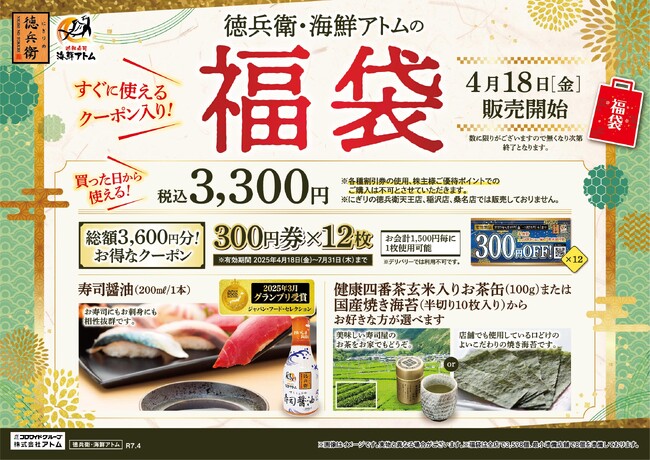 「徳兵衛・海鮮アトムの福袋」予約受付開始!総額3,600円分のお得なクーポンの他、ジャパン・フード・セレクション最高位グランプリ受賞の「寿司醤油」など豪華3点入りで税込3,300円! 株式会社アトム【予約受付開始】2025年4月1日(火)~、【販売開始】2025年4月18日(金)~コロワイドグループの株式会社アトム(本社:神奈川県横浜市 代表取締役社長:田中公博)は、回転寿司... 2025年4月1日 11:00