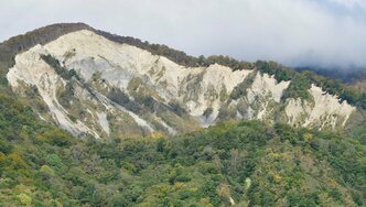 内ケ島氏の居城・帰雲城跡(白川村保木脇)を訪れると、後方の帰雲山の山頂が無残にも大きく削り落ち...