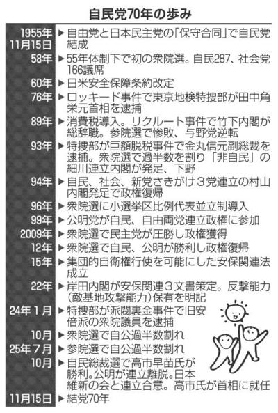 自民きょう結党70年 国政連敗、続く苦境 党是の改憲実現せず 自民党は15日、1955年の結党から70年を迎えた。一時期を除き与党として国政を担い続けてきたが、昨年10月の衆院選、今年7月の参院選で連敗。女性初の党総裁に選ばれた高市早苗首相は公明党の連立政... 2025年11月15日 05:00岐阜