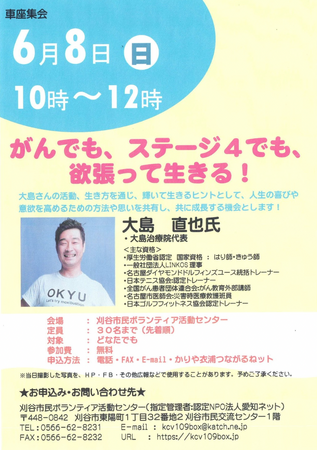 病気があってもあきらめない ハンディキャップを持つ子どもたちの保護者へ送る講演会|大島 直也氏 がんでも、ステージ4でも、欲張って生きる!|6月8日(日)10:00~ 刈谷市民ボランティア活動センター 2025年5月23日 09:00岐阜