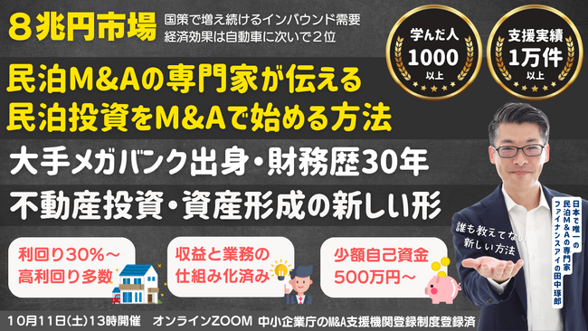民泊投資はゼロから立ち上げるな!収益化された民泊事業をM&Aで取得する。少額自己資金で高利回りの民泊M&A。不動産投資にも役立つ新しい資産形成『民泊M&A投資』セミナー開催~初めての方にも分かりやすく 2025年10月7日 08:00岐阜