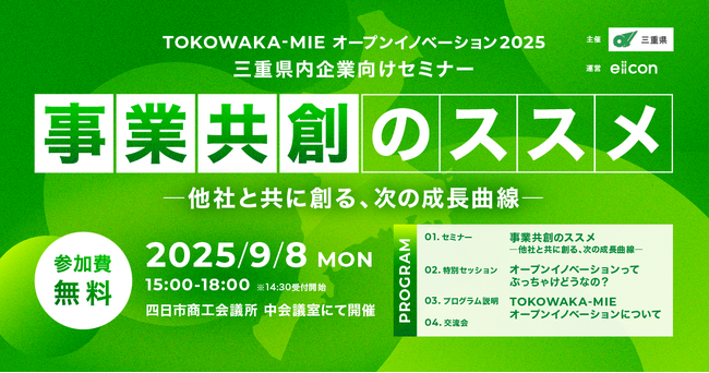 【 三重県 × eiicon 】連続4期目の運営開始! 「TOKOWAKA-MIE オープンイノベーション推進事業」 三重県内企業向け新規事業創出セミナー 9月8日(月)開催 参加者募集を開始! 2025年8月7日 14:00岐阜