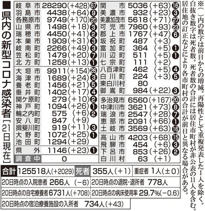 【27日速報】岐阜県内で2396人が新型コロナ感染 2人死亡 岐阜県と岐阜市は27日、県内で新たに2396人の新型コロナウイルス感染と2人の死亡を確認したと発表した。県内の感染者は計13万8299人、死者は計360人となった。 2022年7月27日 15:17