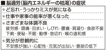 誰しも、環境の変化(家庭・職場)や病気、老化によって「脳内エネルギー」は減少します。さらに、コロナ社会のように不安感が継続すると脳も疲れます。「脳過労」では表のような症状が現れます。脳の情報処理能力が低下するため、記憶力や思考力が低下し認知症によく似た症状を呈してきます。