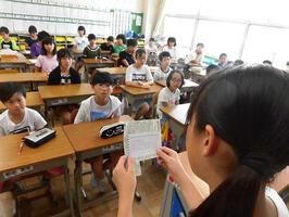 「被災地は遠い出来事ではなく、身近なことだと実感した。この写真は関市の被害状況と災害ボランティアの人たちの支援の様子。7月7日、8日に大雨特別警報が発令されたが、いつ、どんな状況になるのかわからないのが自然の怖さ。お互いを守り合う行動を学ぶ命を守る訓練の大切さを改めて実感した」と語るのは、林優吾さん(11)。『西日本豪雨死者157人に』という見出しの記事を選び、小見出しにある『関市779棟浸水』の部分を示しながら、1分間スピーチが始まった。このスピーチを聞き、何かできることはないかと考え始める仲間が教室の中にいた。