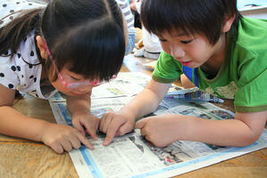 小さな手で大きな新聞を開くと、そこに、気になる写真がたくさん載っていた。「あっ、このサッカーの試合、知っているよ。この選手すごいよ」「これきれいなお花。おばあちゃん家にもあるよ」と仲間同士でお互いが興味のある内容を伝え合っていた。