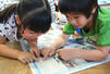 2年生の教室では、図画工作の授業で立体作品を作るために新聞を使っていた。新聞は、大きな袋の中に詰め込み、膨らませる役目として使用される。自分の作りたいものが決まると、早速新聞を開いてくしゃくしゃにするのである。