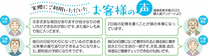 健康長寿手帳はこれまで全国で4万冊以上売れた人気商品。2025年版がシニアライフ総研のビジネスアワード2024でプロダクト賞を受賞しました。購入者アンケートによると、88%が「満足」と答え、父母や祖父母にプレゼントした人もいます。