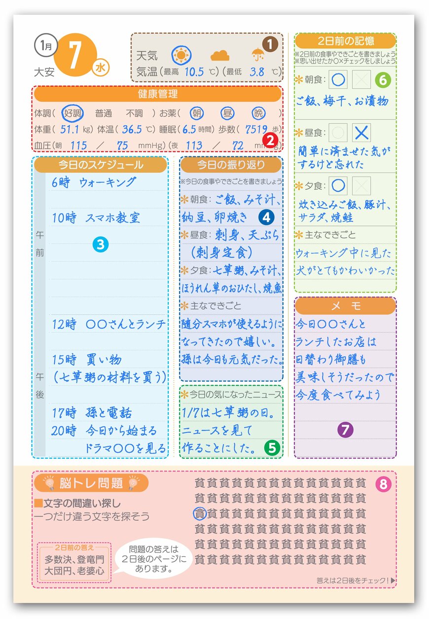 日々のスケジュールや健康状態などを記録しつつ、短期記憶トレーニングになる“2日前の食事”をチェックする項目も。パズルなど毎日続ける脳トレ問題も充実し、盛りだくさんの内容です。