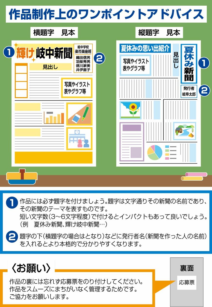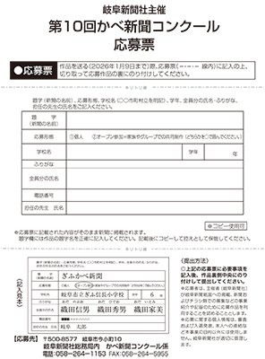 ※応募者は、主催者(岐阜新聞社)が岐阜新聞紙面への掲載、新聞およびチラシ類での募集などの事業紹介や記録のために応募作品を利用することを認めることとします。