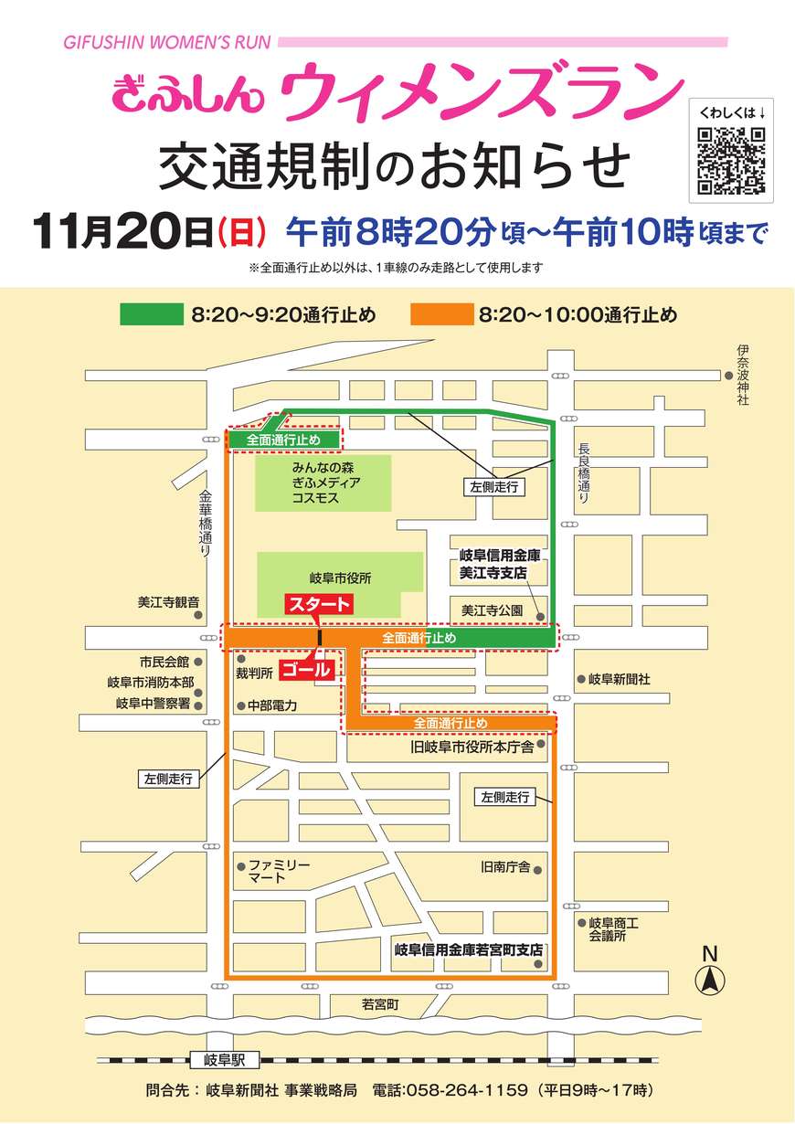 ■注意事項 ①参加資格:自己の健康について異常のないことを確認した方で、自分の力で走れる健康な小学4年生以上の女性。年齢は大会当日の満年齢を基準とします。②更衣室は「ぎふメディアコスモス館内」にご用意します。更衣室は受付後、使用可能となります。③貴重品の保管は各自の責任とします。盗難・紛失等の責任は主催者では負いかねます。④当日のケガ・事故については参加者の責任とし、主催者は応急手当のみを行います。⑤参加者は各自で健康診断を受けるようにしてください。なお、当日体調の悪い方は走らないでください。⑥参加者は当日に会場受付でアスリートビブス(ナンバーカード)をお受け取りください。アスリートビブスの事前送付はありません。当日受け取ったアスリートビブスは胸と背中につけてください。⑦交通規制時間内に競技を終えるため関門を設けます。関門時刻を過ぎた選手は、以降の競技を打ち切ってください。また、関門前でも関門時刻をオーバーすると思われる選手は、走行状態により競技を中止していただきます。⑧受付は部門ごとに行います。当日参加は受け付けません。⑨スタートの整列はスタッフの指示に従ってください。⑩参加者等の肖像権は主催者に帰属します。(大会中の映像・写真等を報道や宣伝の目的で使用します)⑪参加者用駐車場は設けておりませんので、公共交通機関をご利用ください。