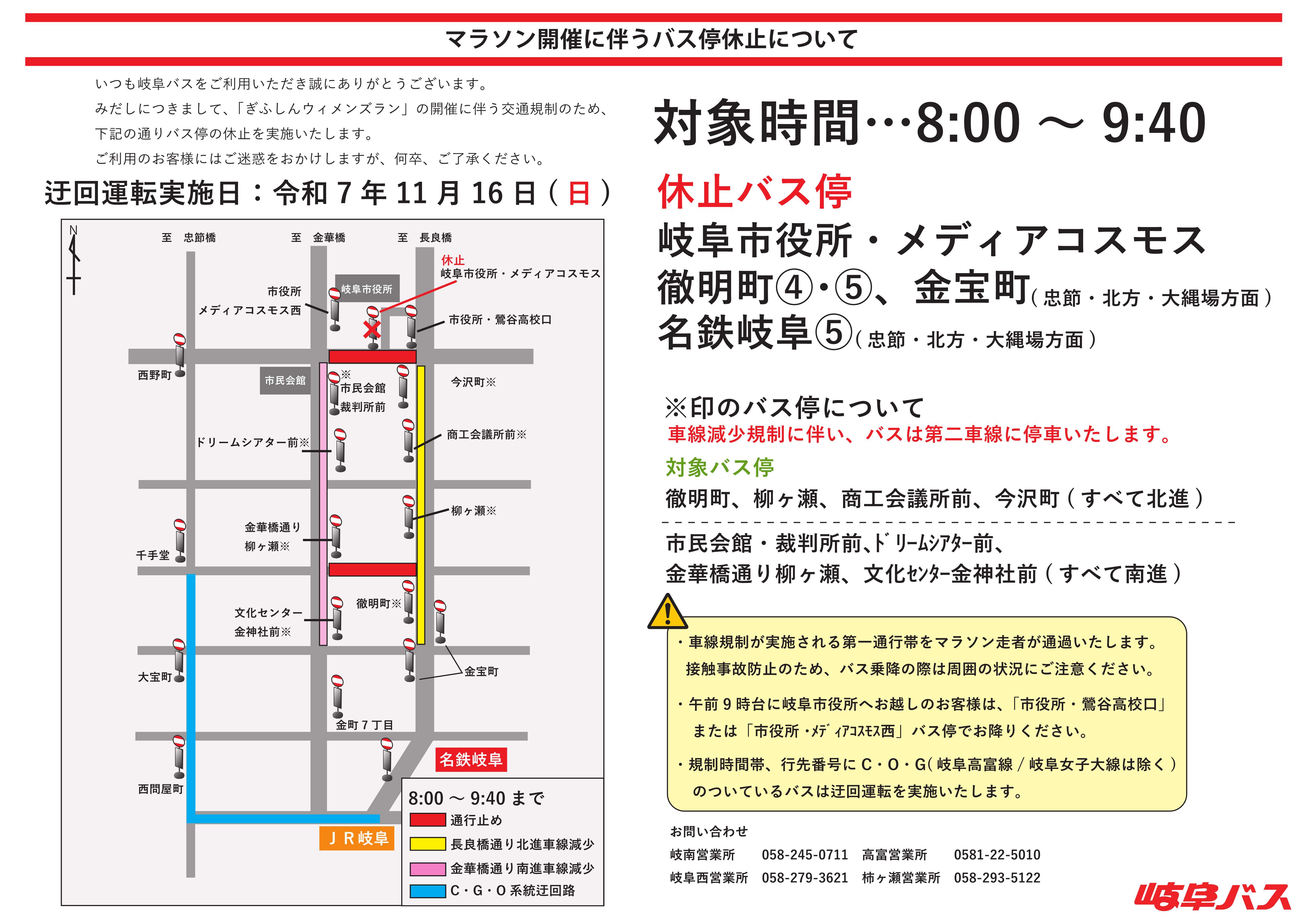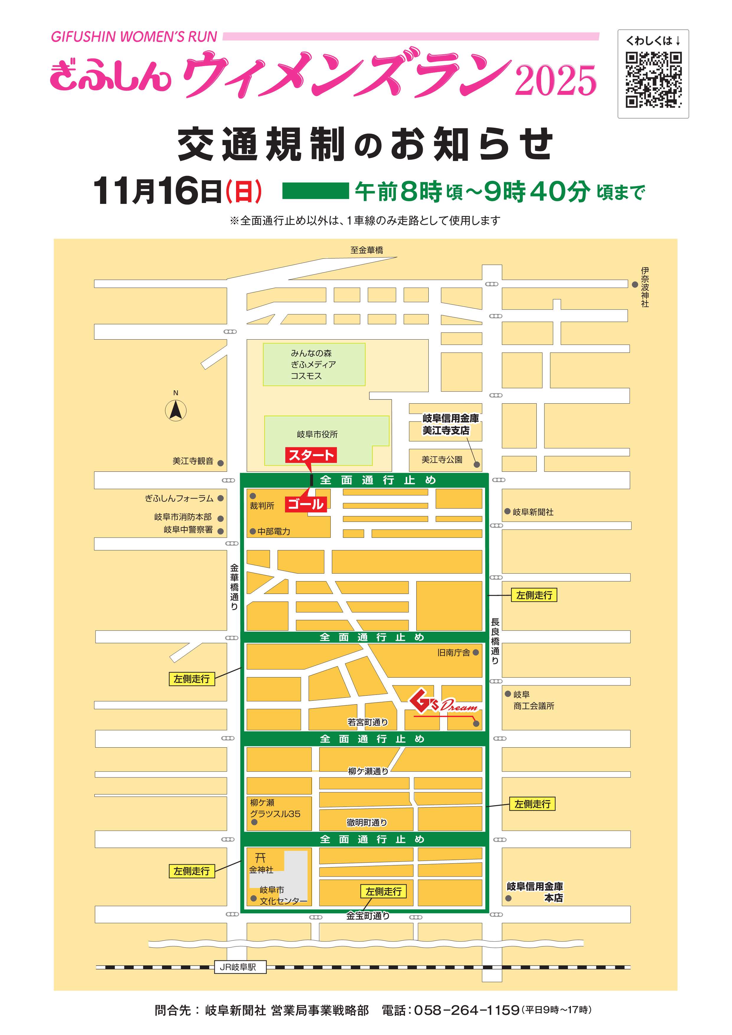 ■注意事項 ①参加できる方は健康で走れる小学4年生以上の女性です。年齢は大会当日の満年齢を基準とします。②更衣室(兼手荷物置場)は「ぎふメディアコスモス館内(みんなのホール、みんなのギャラリー)」にご用意します。更衣室は受付後、使用可能となります。③貴重品の保管は各自の責任とします。ロッカー等のご用意はありません。盗難・紛失等の責任は主催者では負いかねます。④当日のケガ・事故については参加者の責任とし、主催者は応急手当のみを行います。⑤当日、体調の悪い方は走らないでください。⑥ナンバーカード(ゼッケン)は、当日会場受付でお渡しします。当日受け取ったナンバーカードは胸と背中につけてください。安全ピンは受付でお渡しします。⑦交通規制時間内に競技を終えるため関門を設けます。関門時刻を過ぎた選手や関門時刻に間に合わないと主催者が判断した選手は、競技を中止していただきます。⑧受付は部門ごとに行います。当日参加は受け付けません。事前に送付する参加証(はがき)を必ず持参してください。⑨スタートの整列はスタッフの指示に従ってください。⑩参加者等の肖像権は主催者に帰属します。(大会中の映像・写真等を報道や宣伝の目的で使用します)⑪参加者用駐車場は設けておりません。公共交通機関をご利用ください。