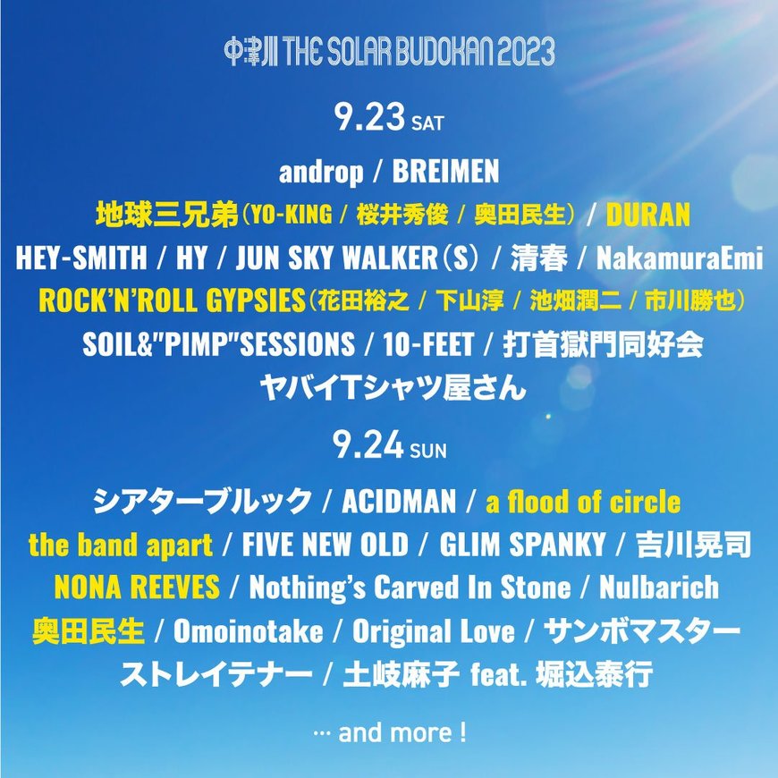 9月23日(土) androp、BREIMEN、Caravan、地球三兄弟(YO-KING、桜井秀俊、奥田民生)、DURAN、HEY-SMITH、HY、韻シスト、いとうせいこう is the poet、JUN SKY WALKER(S)、清春、Major in Body Bear(from 台湾)、NakamuraEmi、OAU、PLECTRUM、ROCKIN' QUARTET(大木伸夫、ホリエアツシ、村松拓、TOSHI-LOW、内澤崇仁)、ROCK'NROLL GYPSIES(花田裕之、下山淳、池畑潤二、市川勝也)、SOIL&"PIMP"SESSIONS、10-FEET、打首獄門同好会、うじきつよし、ヤバイTシャツ屋さん