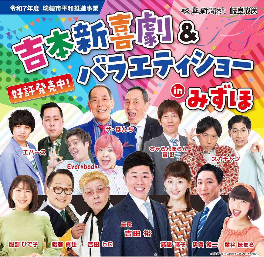 令和7年度瑞穂市平和推進事業 『 吉本新喜劇 & バラエティショー in みずほ』を11月30日(日)ココロかさなるCCNセンター(岐阜県瑞穂市)で開催します。いつも大入りの新喜劇や人気お笑い芸人の漫才など、抱腹絶倒のステージを存分にお楽しみください。座長決定!人気座長・吉田裕が務めます!吉田ヒロ、高橋靖子に続き、松浦真也、服部ひで子、重谷ほたる、伊賀健二の出演も決定。バラエティショーには、ザ・ぼんち、ちゃらんぽらん冨好、スカチャン、Everybody、トニーフランク、大谷健太の出演が決定!他の出演者は決まり次第お知らせします。チケット、好評発売中!