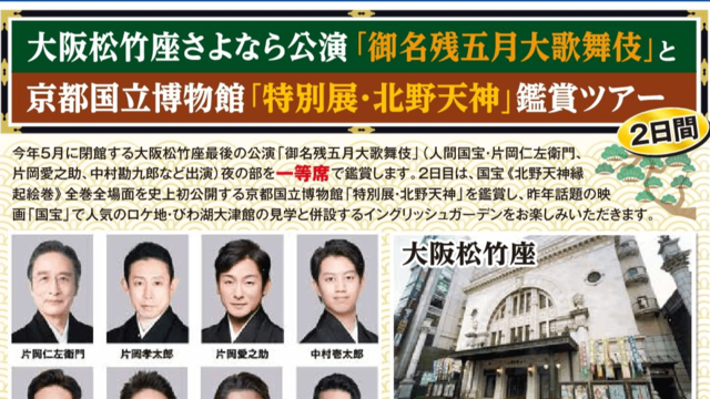 大阪松竹座さよなら公演「御名残五月大歌舞伎」と京都国立博物館「特別展・北野天神」鑑賞ツアー<2日間>