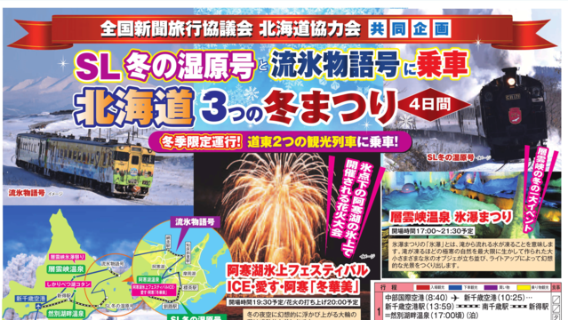SL冬の湿原号と流氷物語号に乗車 北海道3つの冬まつり<4日間>