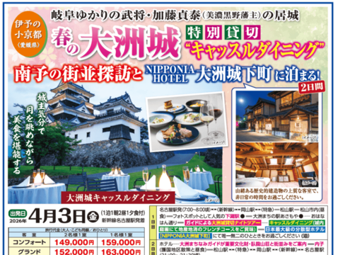 春の大洲城・特別貸切”キャッスルダイニング”、南予の街並探訪とNIPPONIA HOTEL大洲城下町 <2日間><募集終了>