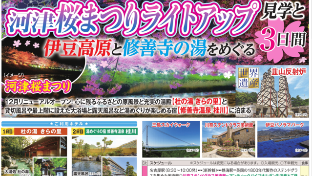 河津桜まつりライトアップ見学と伊豆高原&修善寺の湯をめぐる<3日間>