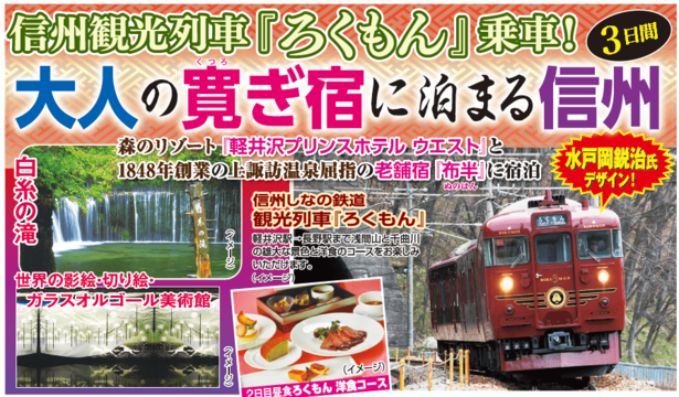 信州観光列車「ろくもん」乗車!大人の寛ぎ宿に泊まる信州<3日間>