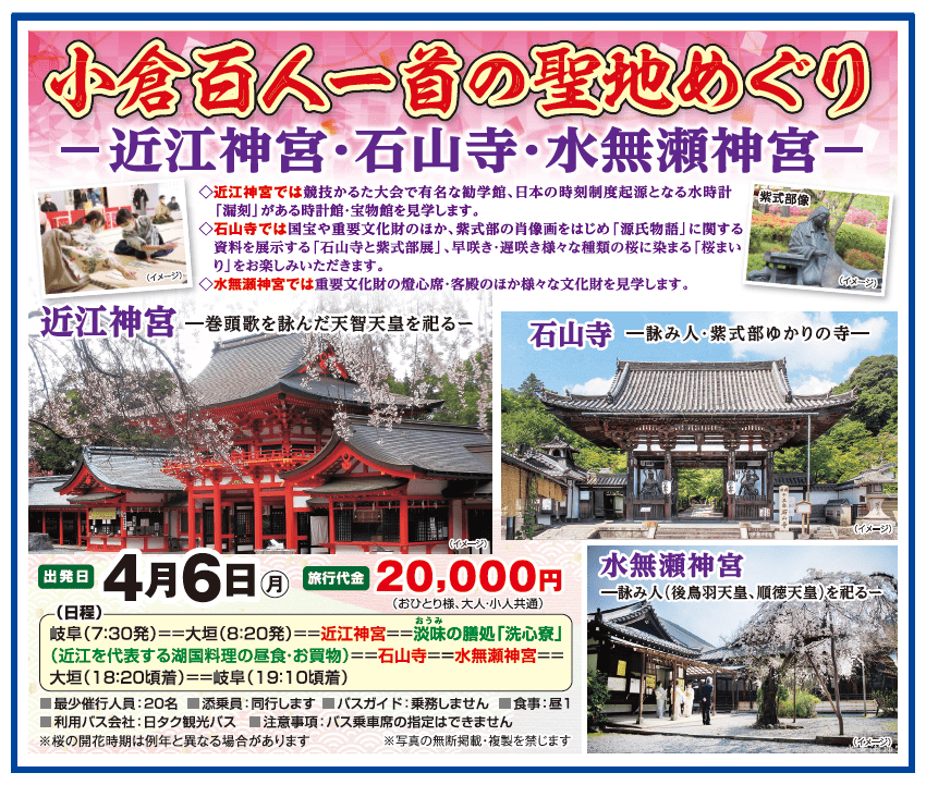 近江神宮では競技かるた大会の会場として有名な勧学館や時計館・宝物館/石山寺では、国宝や重要文化財のほか、紫式部の肖像画はじめ「源氏物語」に関する資料を展示する「石山寺と紫式部展」、早咲き・遅咲き様々な種類の桜に寺全体が染まる「桜まいり」/水無瀬神宮では重要文化財の燈心席・客殿のほか様々な文化財をご覧いただきます。昼食は近江を代表する湖国料理をお楽しみいただきます。日タク観光バス新入社員の山口瑠花さん(岐阜総合学園高校出身)が企画しました! 申し込み受付中!